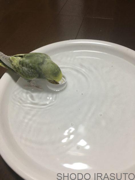 水浴びをすると、水の中で羽やお尻をバサバサさせるので、水しぶきが結構広く飛びます。
